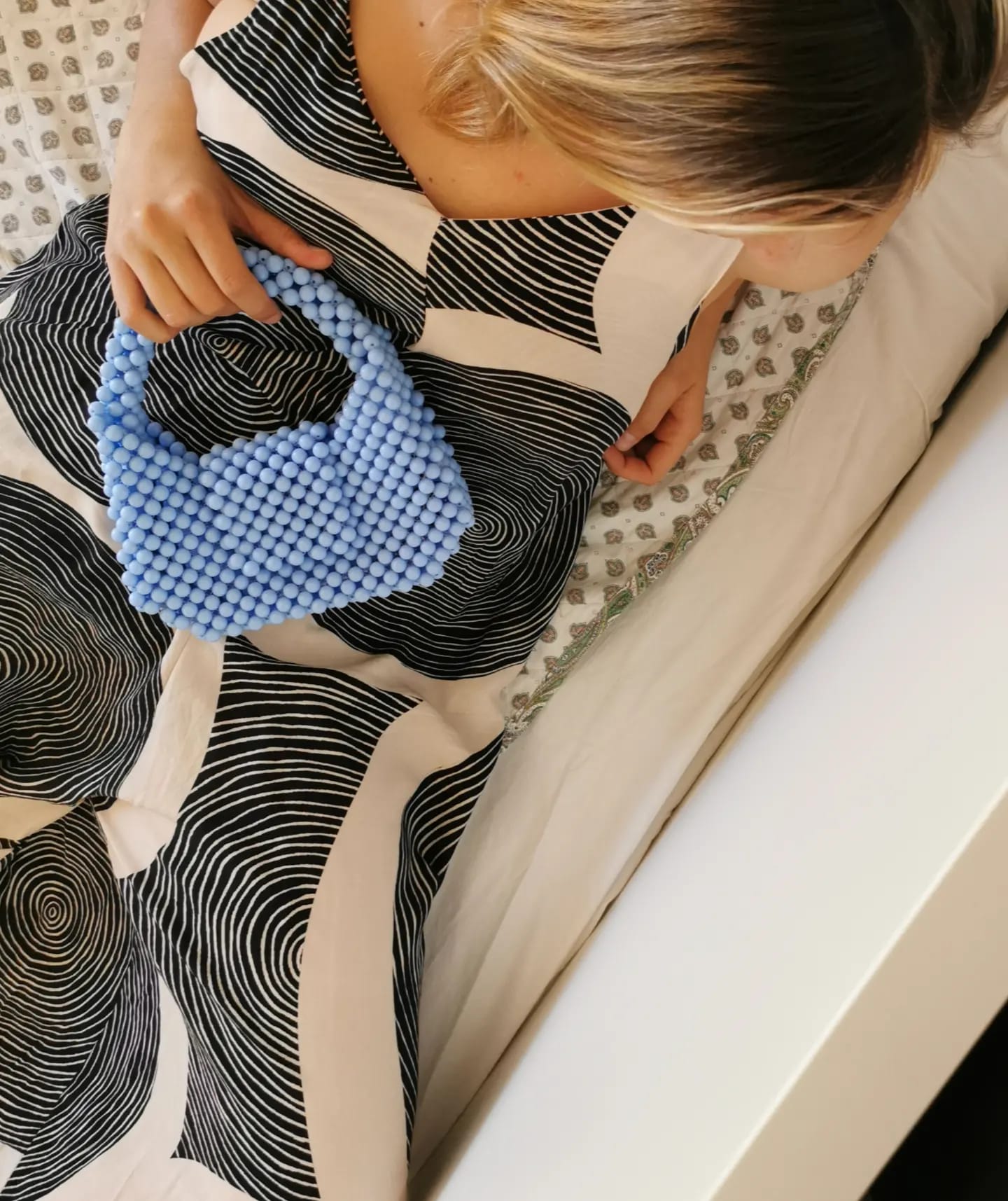 Borsetta Bubble azzurra realizzata con perline in resina da portare a mano, comoda, pratica e leggera.